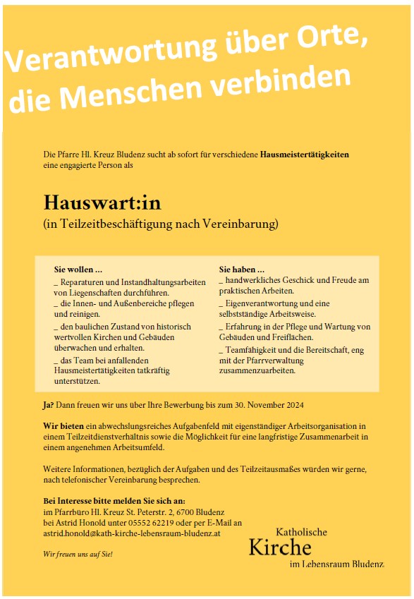 Die Pfarre Hl. Kreuz Bludenz sucht ab sofort für verschiedene Hausmeistertätigkeiten eine engagierte Person als