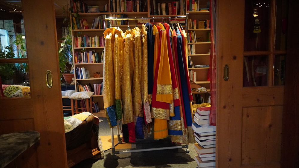 Sabine schätzt es, ihrer Kreativität freien Lauf zu lassen. „Das Nähen an sich kostet gar nicht so viel Zeit, aber das Ausprobieren und Experimentieren, wie die Stoffe zusammenpassen, das kostet einiges an Hirnschmalz“, gibt sie zu. Oft leistet ihr dabei ihre Katze Gesellschaft, die sich gerne auf den Stoffen ausbreitet und es sich gemütlich macht. Und so glitzert und funkelt es überall in Sabines Haus, weil gelegentlich goldene Fäden vom Stoff abfallen und sich im ganzen Haus verteilen. „Es ist, wie es ist“, sagt sie mit einem Lächeln.