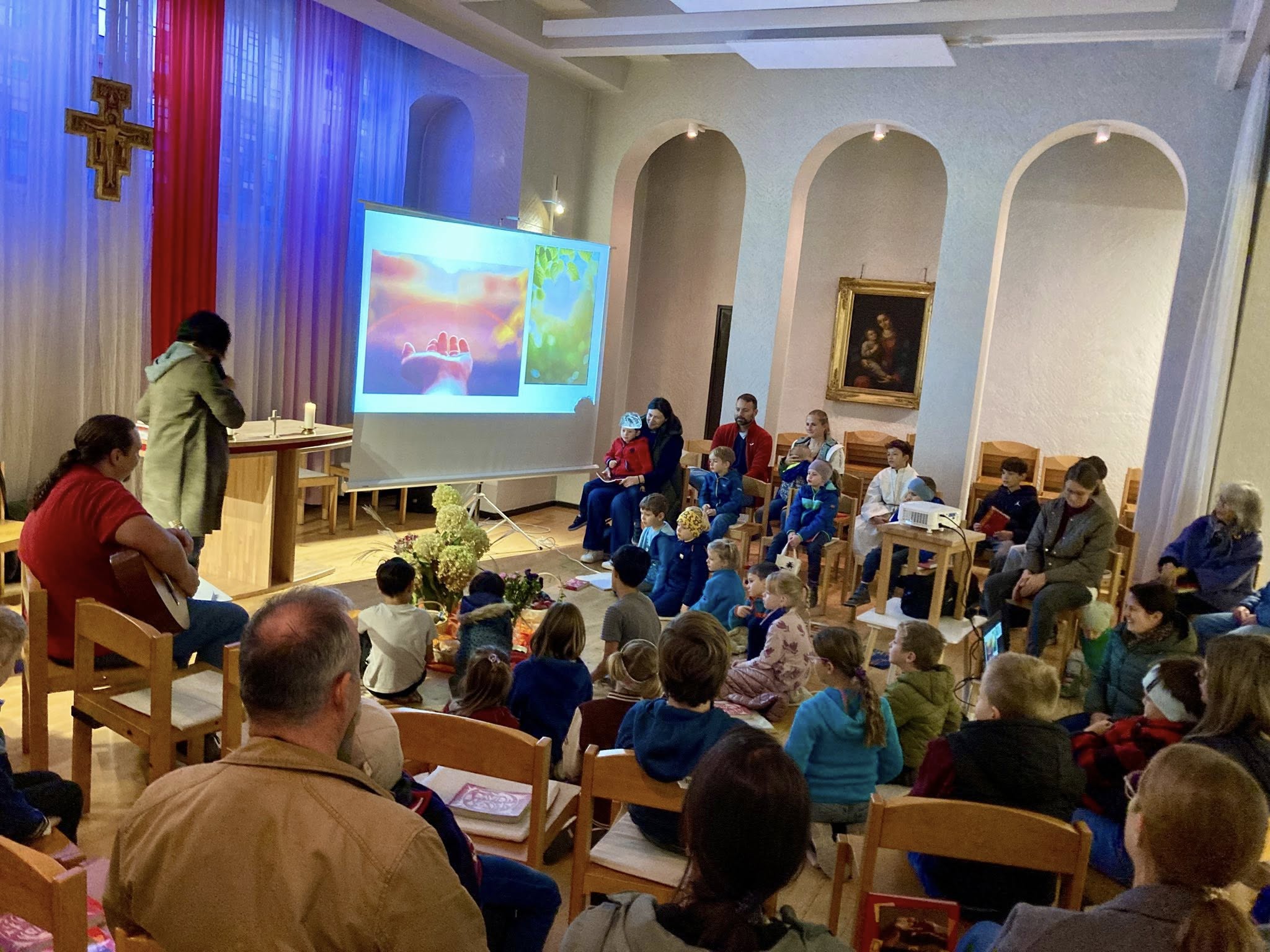 Die jüngsten Teilnehmenden begaben sich wenige Minuten nach Beginn der Messfeier - teils in Begleitung ihrer Vertrauenspersonen - in die Unterkirche, wo Kinderkirche stattfand. Rechtzeitig zum "Vater unser" kehrten sie in die "große Kirche" zurück, um sich dort gemeinsam mit Kaplan Jakob Geier um den Altar zu versammeln.