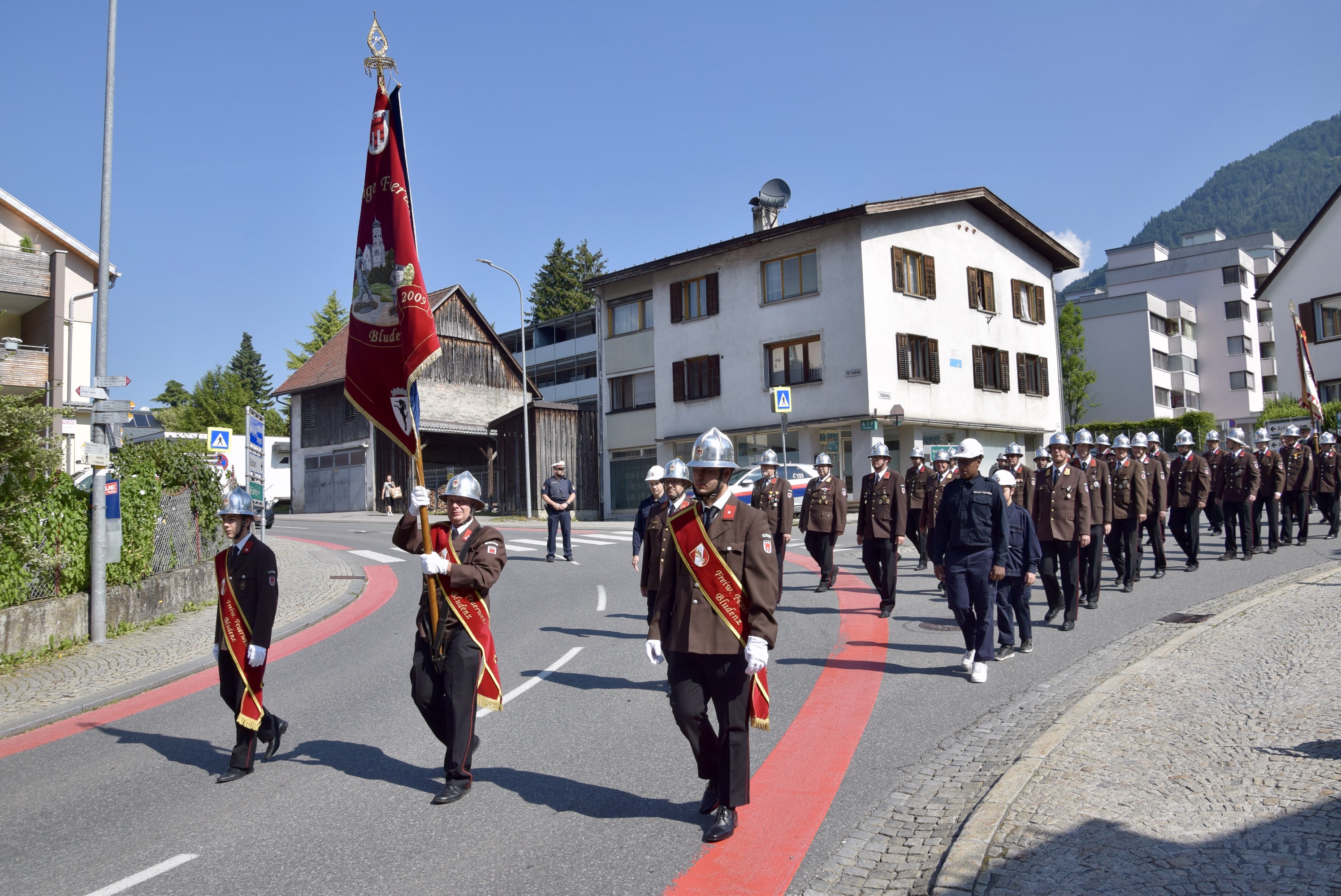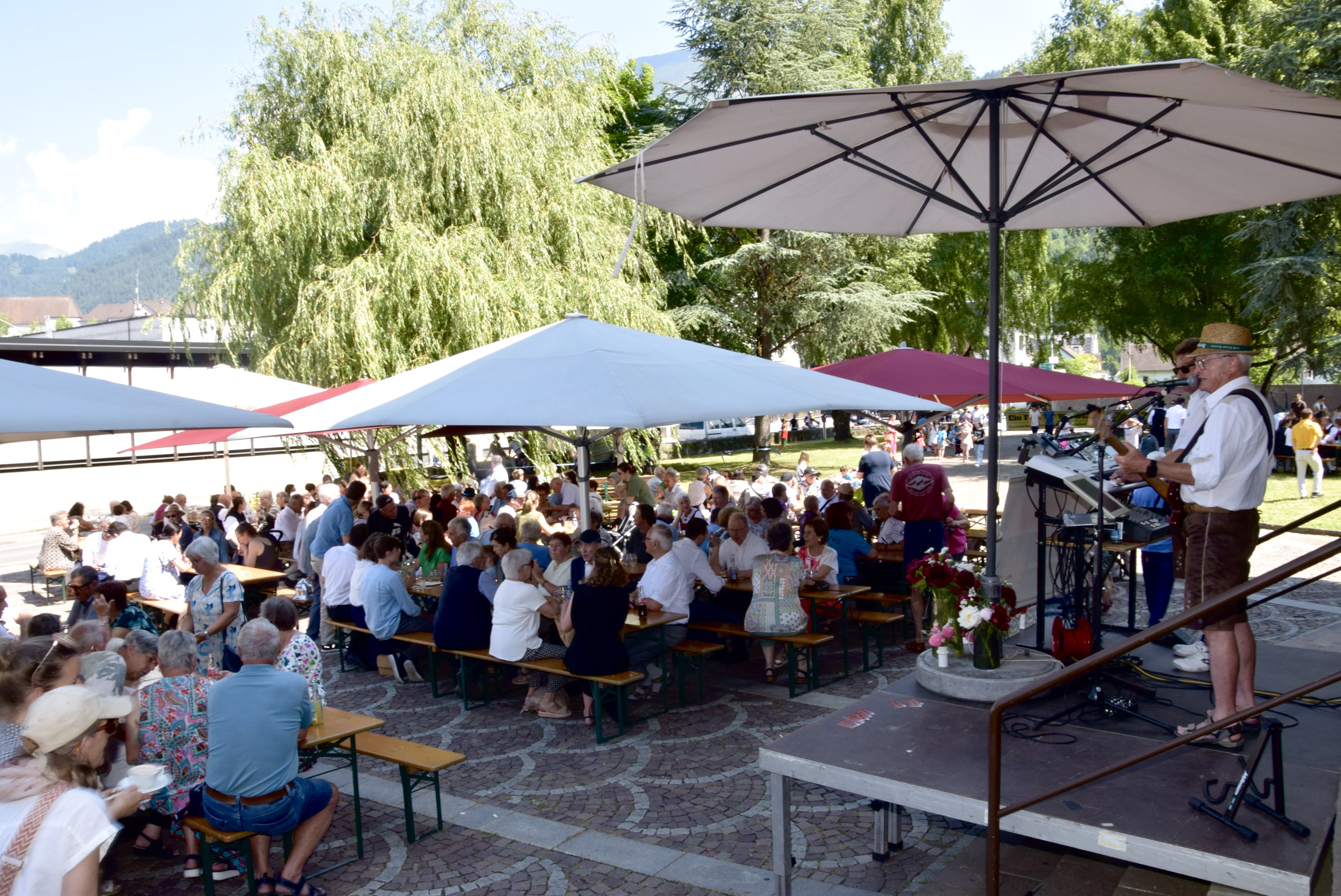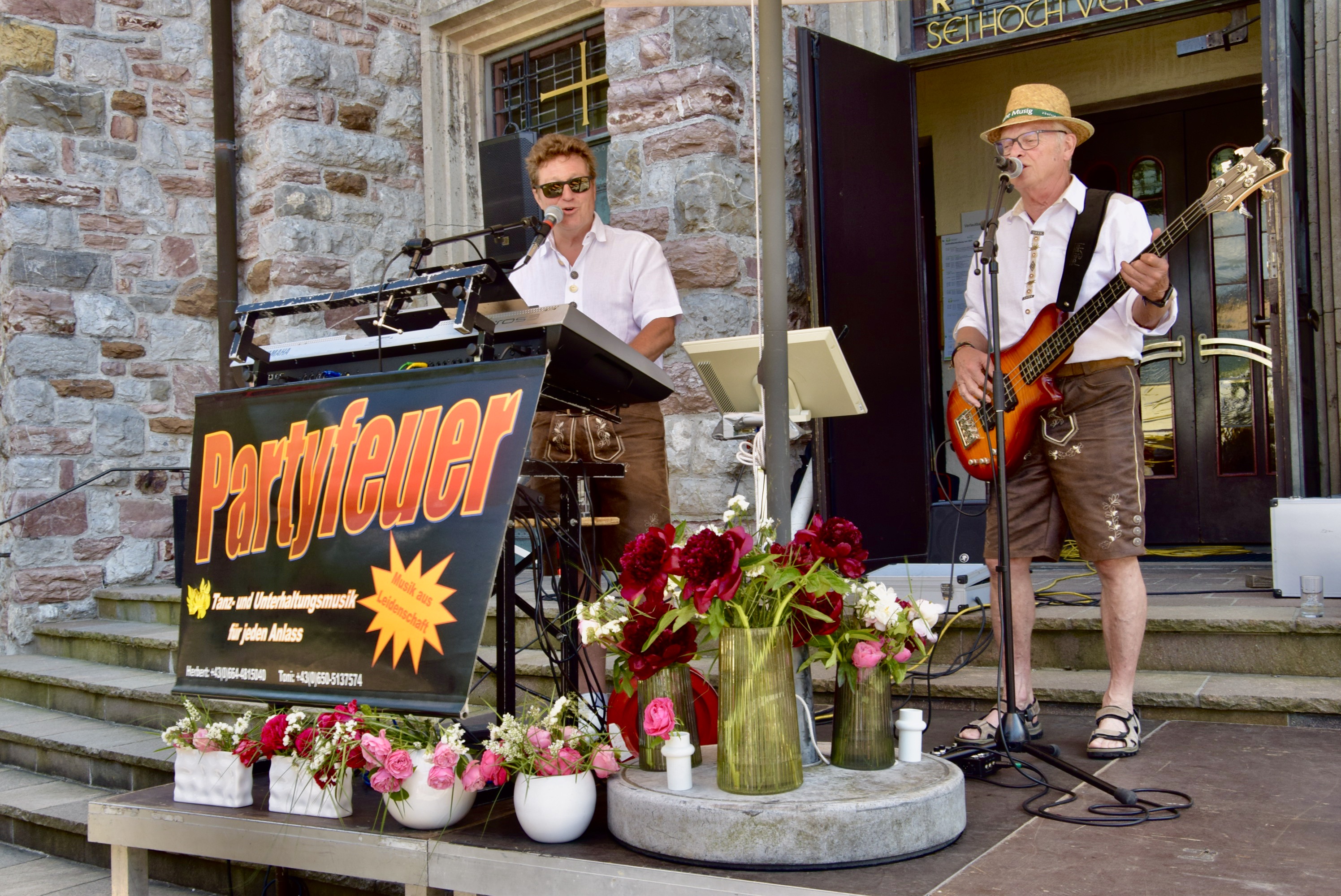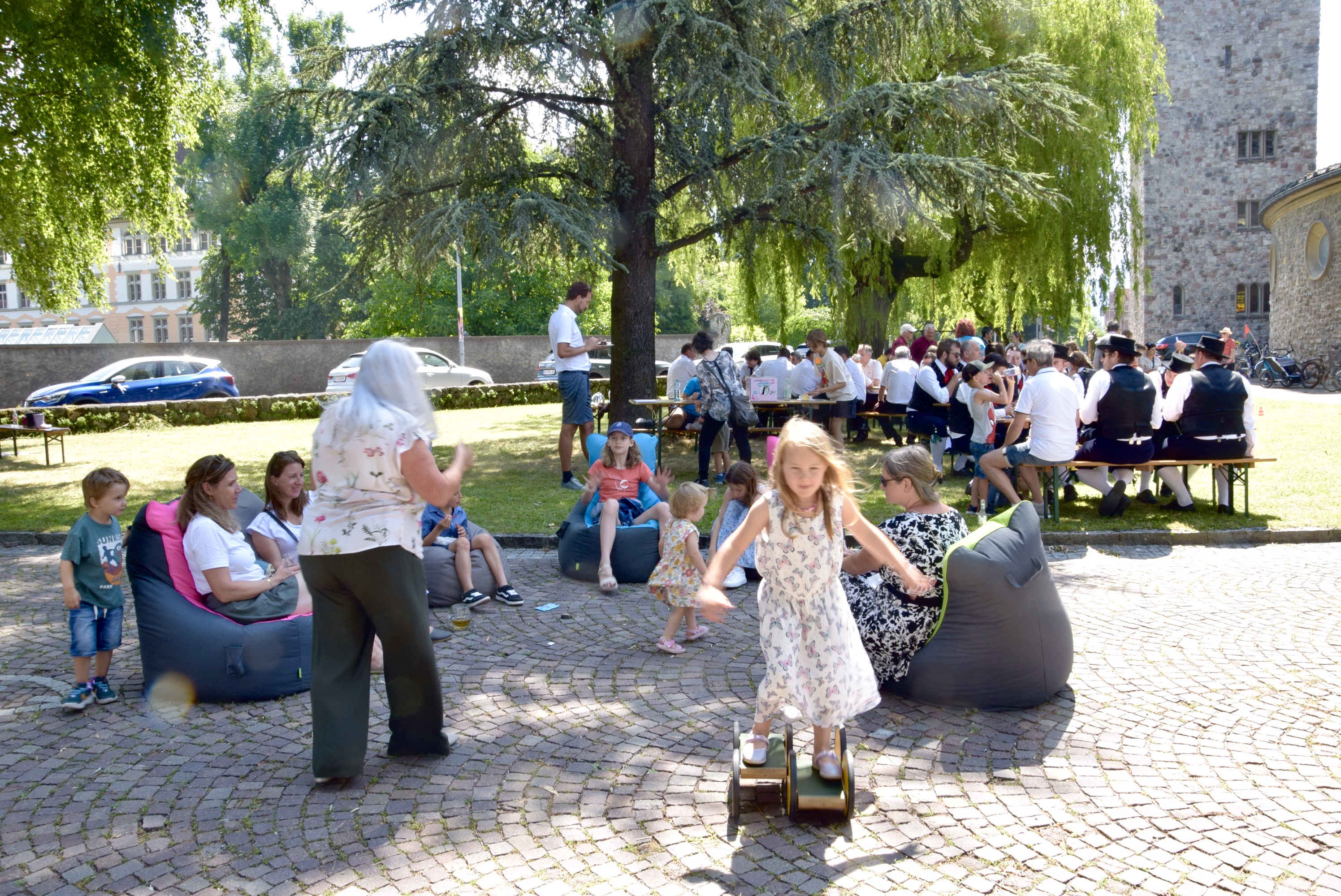 Im Anschluss an die Messe zogen die Anwesenden – unter ihnen die Feuerwehr, der Kameradschaftsbund, der Kolpingverein, der Bludenzer Liederkranz, der Franziskanerchor und Vertreter des Seelsorgeraumes – in einer feierlichen Prozession durch die Altstadt zur Heilig-Kreuz-Kirche. Dort fand am Kirchplatz ein mehrstündiges, bewirtetes Pfarrfest mit dem Musikduo „Partyfeuer“ statt. Die jüngsten Besucher*innen konnten sich auf der Spielstraße mit acht Stationen austoben. Der Pfarrkindergarten Heilig Kreuz bot Bastelarbeiten, kleine Blumenstöcke, Kräutersalz und Karten zum Verkauf an.