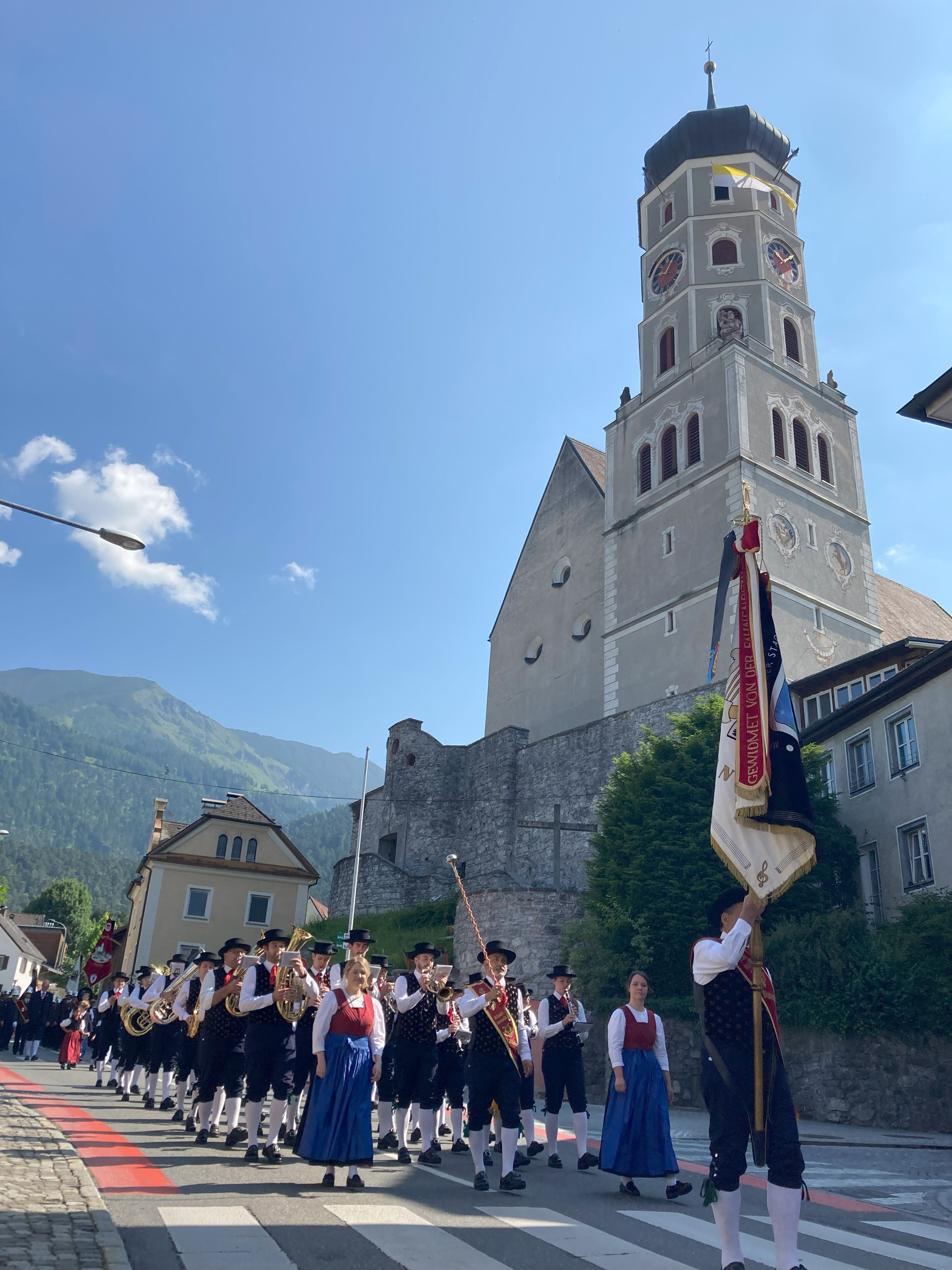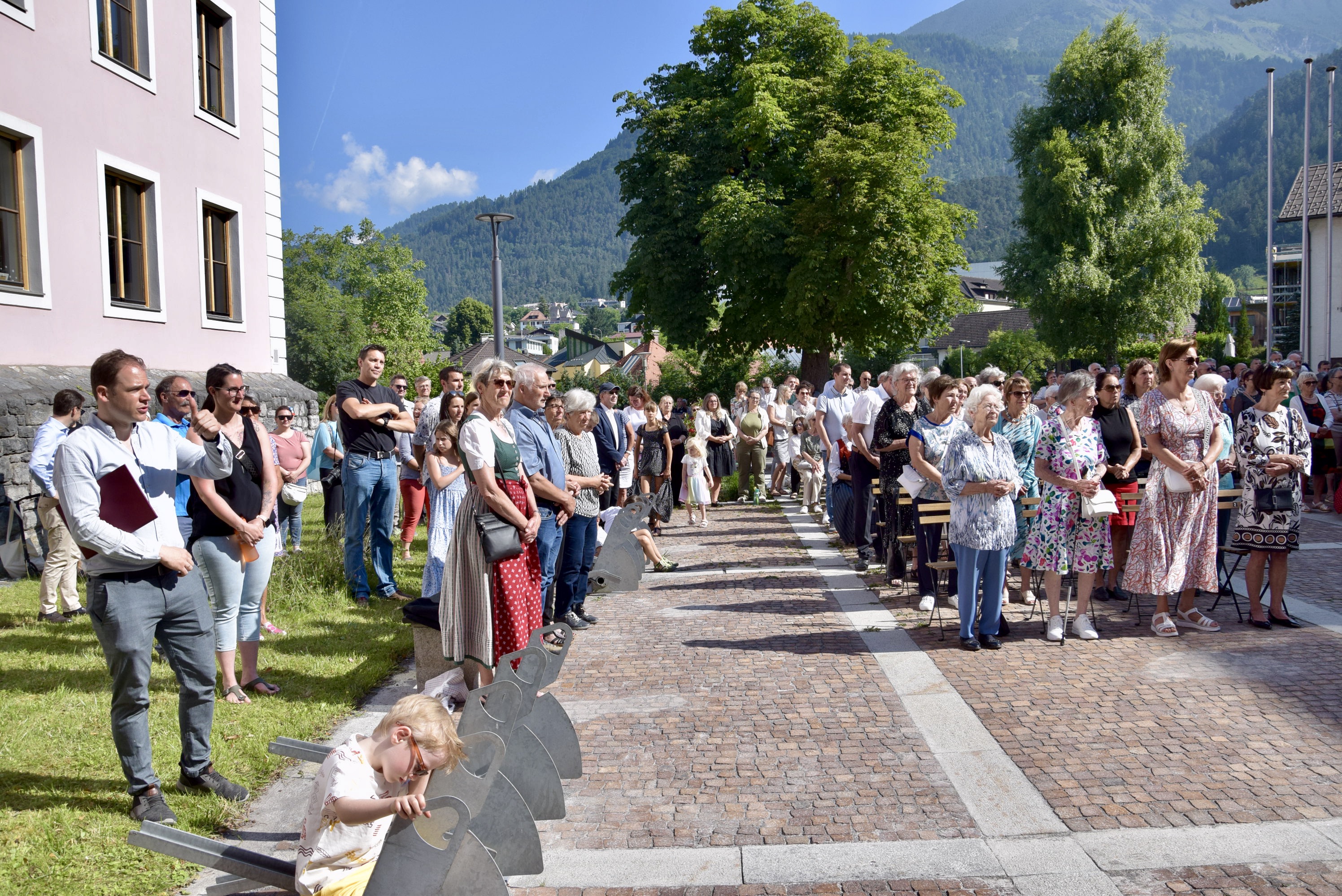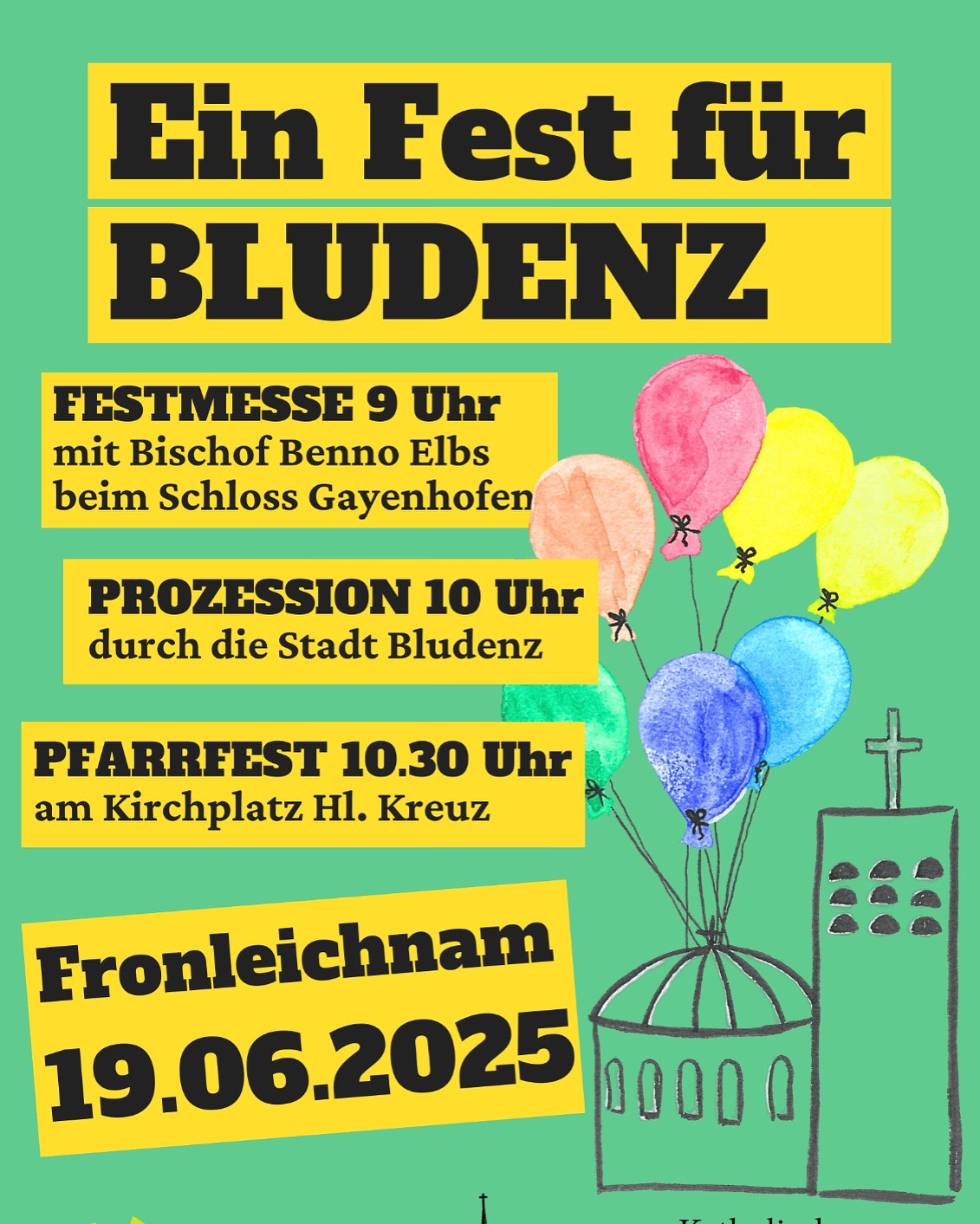 An Fronleichnam, dem 19. Juni 2025, luden die Stadtpfarren Hl. Kreuz und Herz Mariae Bludenz sowie das Franziskanerfestteam zum stimmungsvollen „Fest für Bludenz“ mit Diözesanbischof Benno Elbs, Pfarrmoderator Pater Guido und den Pfarrgemeindeleitern Thomas Folie, Sabrina Wachter und Mladen Milić ein. Die Stadtmusik Bludenz unter der Leitung von Kapellmeister Klaus Melmer sowie die Kinderchöre „CantaKids“ und „CantaJuniors“ gestalteten die Festmesse am Vorplatz von Schloss Gayenhofen (Bezirkshauptmannschaft Bludenz) musikalisch.