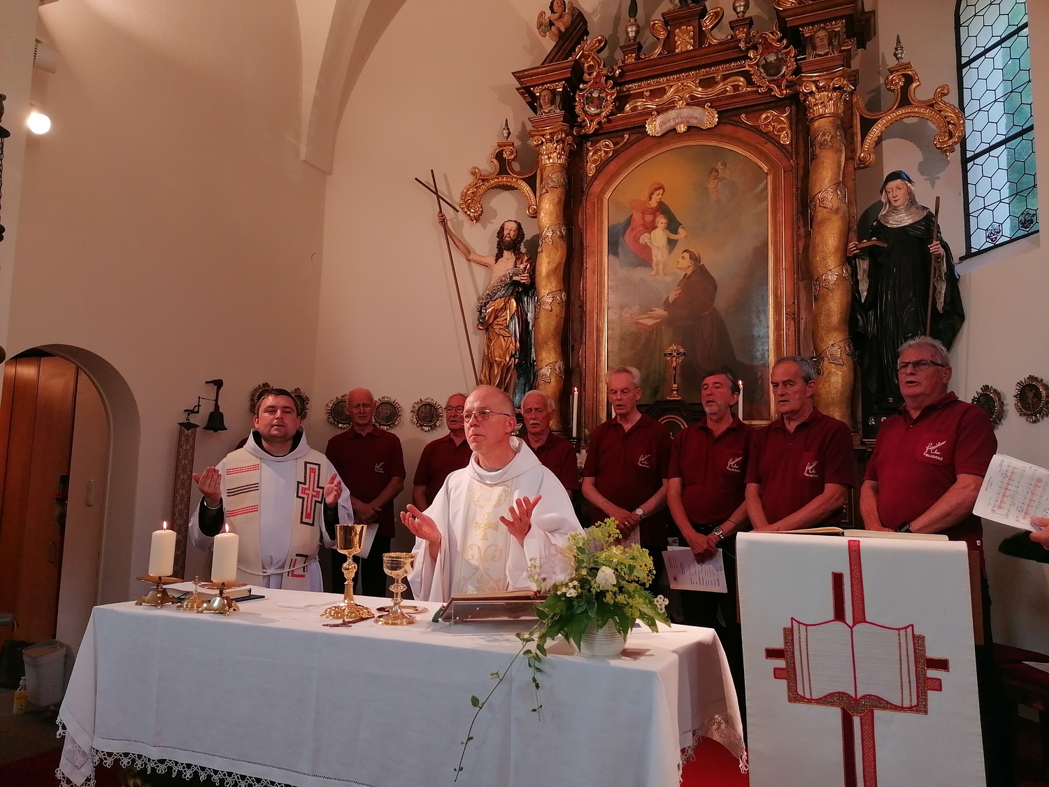 Pfarrer Pater Guido feierte mit Pater Xaver den Festgottesdienst, der mit wunderschönen Liedern vom Franziskanerchor mitgestaltet wurde. Gleich zu Beginn wurde das wunderschöne Holzkreuz gesegnet. Es soll die Besucher beim Verlassen der Kirche immer wieder daran erinnern, dass Jesus mit uns auf dem Weg ist. In seiner Predigt nahm Pater Guido Bezug auf das Leben des Hl. Antonius von Padua. Im Namen der St. Antoniusbruderschaft dankte Heinz Seeburger am Schluss der Hl. Messe den Franziskanern für ihre seelsorgliche Betreuung, dem Franziskanerchor für die musikalische Mitgestaltung. Ein Großer Dank galt Martin Mallitsch und der Familie, für die Leihgabe des Holzkreuzes. Ein besonderer Dank galt aber vor allem dem Kirchenteam mit Lothar Bickel und Fredi Burtscher, die sich vor allem um den Erhalt des Kirchleins und die notwendigen Reparaturen kümmern, der Mesnerin Martha Rödhammer und ihrer Helferin Elvira Rainer und Frau Matt für die Orchideen. Anschließend an die Patroziniums Feier waren dann alle zu einer Agape, zur Begegnung im Miteinander am Kirchplatz geladen. Alle fühlten sich wohl, tauschten sich aus und feierten bis spät in den Abend hinein.