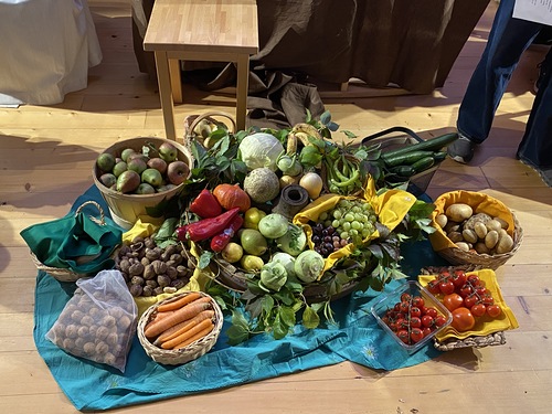 Die Kinder haben alle Obst oder Gemüse für die Feier mitgebracht und wir bedankten uns mit Liedern und Gebeten für die guten Gaben.