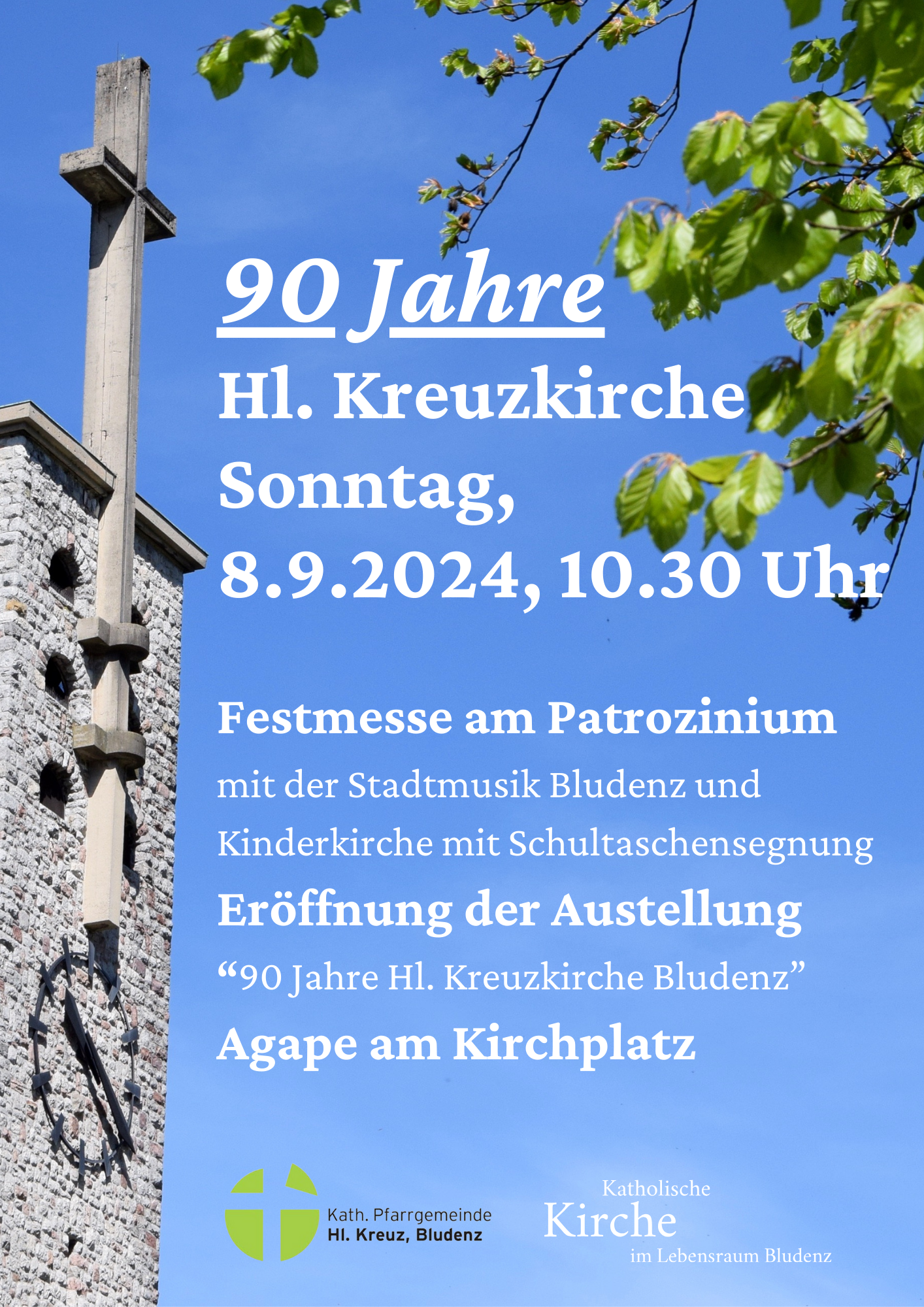 Wir feiern 90 Jahre Kreuzkirche mit der Stadtmusik Bludenz, Kinderkirche mit Schultaschensegnung und anschließender Agape am Kirchplatz. Außerdem wird die Ausstellung „90 Jahre Hl. Kreuzkirche Bludenz“ eröffnet.