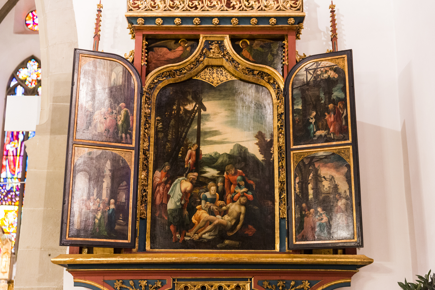 The big lamentation of christ picture in the centre of the altar was signed by Wolf Huber and dated 1521. He painted the descent from the cross in the landscape of Feldkirch to reference what was happening back then in Jerusalem is still happening here and now (there and then). Besides the biblical characters, an unknown spectator draws the painting’s viewers into the scenery. The painter uses his typical colours in shades of yellowish orange, green, turquoise and crimson for the clothes, which drastically contrast the gloomy atmosphere, a contrast that nods towards the seriousness of the situation. The cross breaks through different horizons and towers over them, thus indicating a luminescent way of light and salvation. The original carved frame harbours eleven figurines of the ancestors of Christ covered in artificial vines.