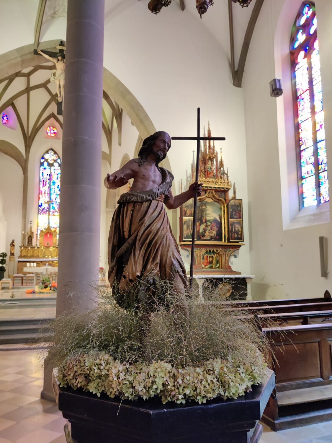 In front of the oil tabernacle is a baroque baptismal font (“shell basin”), beside the back entrance is an additional font, now serving as a holy water font, no longer for babtism. The oldest font of the church (16th century) dominantly marks the crossing of the nave. In its middle stands a wooden John the Baptist in his camel skin clothes.