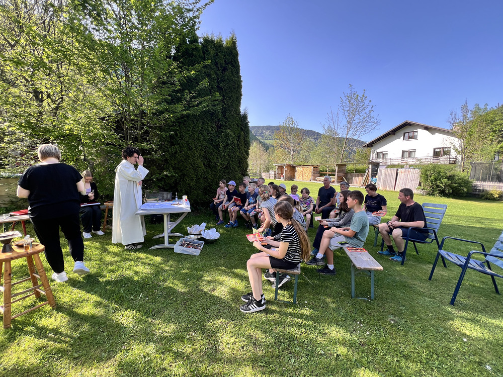 Im Ferienhaus wurden die bewegungsfreudigen Kinder und Jugendlichen bestens verköstigt. Das Wissen um Weihrauch, Brot und Messgestaltung wurde in Workshops vertieft und ausgebaut. Mit Stöckchen, die bei der Wanderung gesammelt wurden, erstellten die Minis noch Kreuze, die zuhause an die Tage in Mellau erinnern.