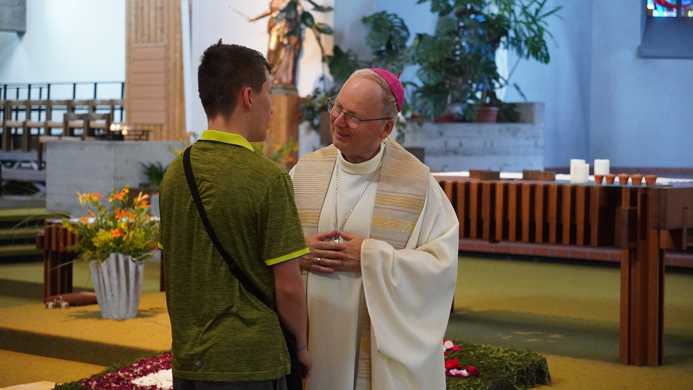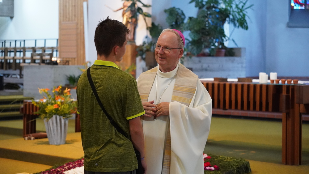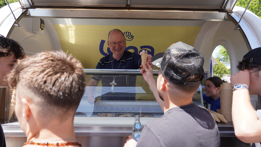 In Göfis angekommen, wartete schon der festliche Abschlussgottesdienst – ein feierlicher Moment mit Bischof Benno, der die Jugendlichen selbst auf der Wallfahrt begleitet hatte und abschließend alle Gedanken und Eindrücke des Tages noch einmal in der Pfarrkirche zusammenführte. Danach wurde im schattigen Garten unter Bäumen gegessen, gelacht und – ganz wichtig – Halleluja-Eis geschleckt. Die Lehrlinge bekamen von Bischof Benno persönlich Europas Eissorte des Jahres, eine Mischung aus Schokolade und gerösteten Haselnüssen, serviert. Dank „Lenas Eis“ konnte die leckere Eissorte direkt vor Ort verkostet werden – ein kleiner Himmel auf Erden sozusagen.